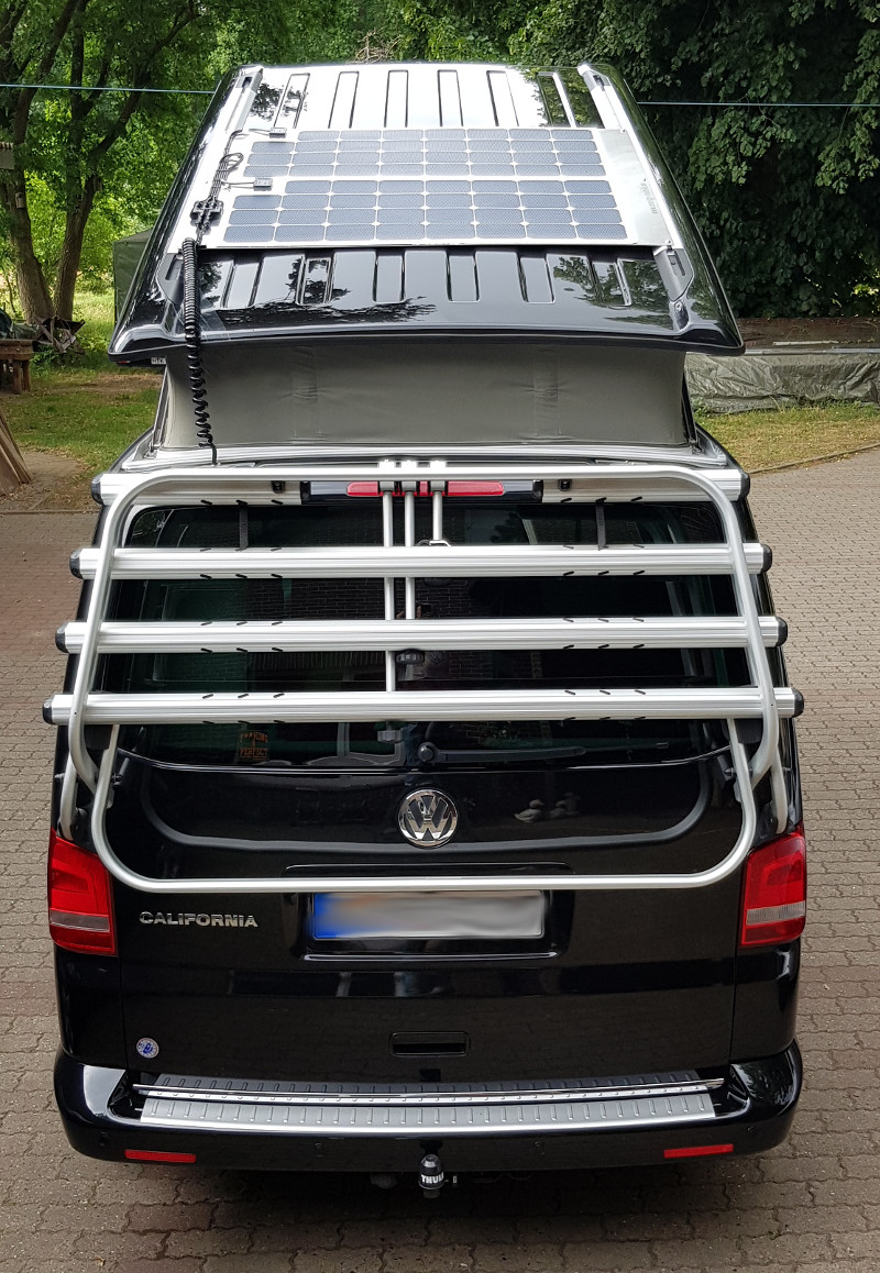 Solar systems on camper vans are usually glued to the roof of the vehicle and the cables are moved through the roof into the interior by means of cable feedthrough. These solar systems can therefore no longer be removed without damage to the vehicle, which is out of the question for most drivers of camper vans and buses. So why not attach the solar system for camper vans to the mostly existing roof rails or mounts. The images each show a solar system mounted on VW T5/T6 California on the roof rails.